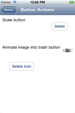 The second button sample I created mimics the animation the iPad Mail app performs when you delete multiple messages. This shows an icon shrinking and fading out as it follows a curve into the Delete button. In the Mail app however this is followed by the Delete button pulsing outward making it appear to gobble up the deleted messages. By combining this effect with the one I described up above you can produce something very similar to Apple’s Mail application.